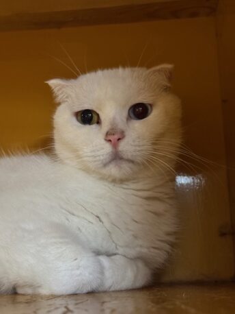 | 色・柄・特徴 | 白色、青と黄のオッドアイ、垂れ耳 | ||
