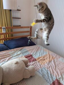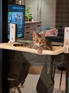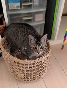 さすが、仔猫ちゃん新生活への慣れも早く、一番良いクッションでゆったりしてもらっています。