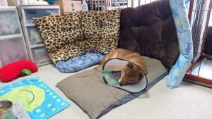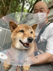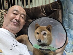 しかも、トライアルが始まって間もなく、トライアルチェックで見つかった目のマイボーム腺腫の手術にハッピーの診療所に連れてきていただかなければなりませんでした💦手術は無事に終わったのですが、術後の管理のご負担をかけることになってしまいました。目を掻かないようにエリザベスカラーをつけっぱなしにしなければならないのですが、兵はカラーをつけたままだとお水もご飯も口にしません。一度外してみていただいたところ、速攻で目を掻き、獣医の先生から大目玉をいただきました。そんな時でも「たとえ兵くんが失明しても最後まで面倒を見ます!」とおっしゃってくださり、兵との根競べでカラーストレスを克服していただきました。