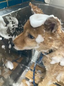 最初は外犬舎で暮らしていた兵ですが、寄る年波も考慮して犬ハウスへ。犬舎の出し入れで抱きかかえると、やはり人が怖いのか大暴れです💦とはいえ、人との距離が多少縮まったのか、ドッグランでおやつをもらいたくて近づいてくるようになりました。そこで、訓練犬にアサインされ、家庭犬として生きていくためのお散歩や体のケアの練習を頑張ってくれました👌詳しくは訓練日記「兵くんのがんばり日記」をご覧ください。途中で足のケガに見舞われたりもしつつ、予想外の優秀さで、着々と課題をクリアしていってくれました。
