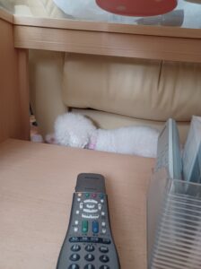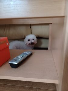 お邪魔してから早速、テーブルとソファの隙間に入り込み、