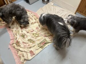今の季節夜はとても寒く、トリミングルームにいるのですが、中に入ると3頭ともしっぽをぶんぶん振ってお出迎えしてくれます。