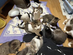 2025/10/31人気者気分 ある日、仕事で使う写真を撮ろうと猫たちのお部屋にお邪魔しました。 写真を撮るのに夢中になってふと我に返るとなんと自分の周りがこんなことに!! 足を枕にされていたり、しっかり膝の上も占領されていました 笑 アイドルってこんな気分なのかなーと人気者になった気分でした笑 ちなみにこちらのお部屋はエイズのキャリアを持っている子たちが暮らしている場所です。 お客さんからは目に付きにくい場所なのですが、どのお部屋よりも1番猫たちが来てくれる気がします!! 飼育班:箕島 前の記事へ 次の記事へ スタッフ日記一覧へ