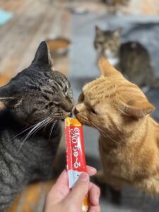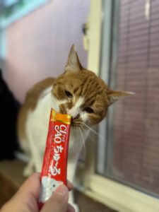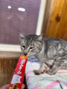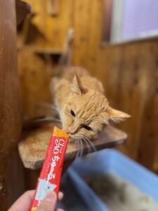 ↑みすみ🐱 いつもは少し離れたところからこちらの様子を伺っているみすみ! この時はチュールに夢中でした!⭐️ みすみ